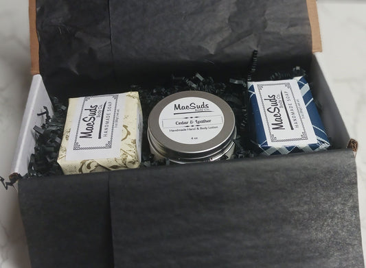 Looking for a thoughtful, ready-to-go gift? Our Natural Gift Sets feature a curated selection of handmade soaps and rich, creamy lotions—all made with skin-loving ingredients. Choose from women's sets with matching scents or men's sets with rugged favorites like Mechanic or Beer Bars. Want it wrapped? Just ask—we’re happy to gift wrap at no extra charge!